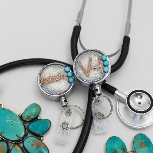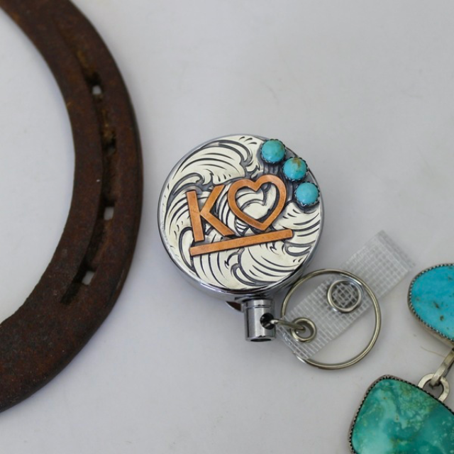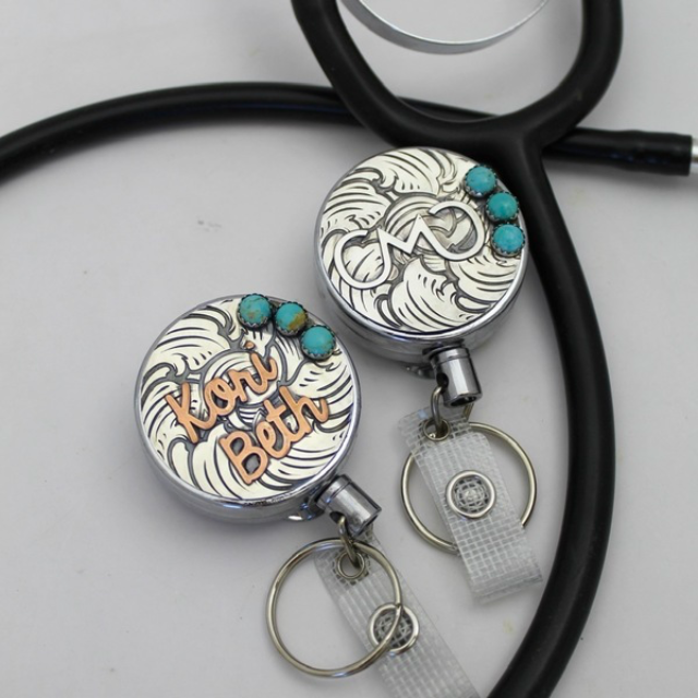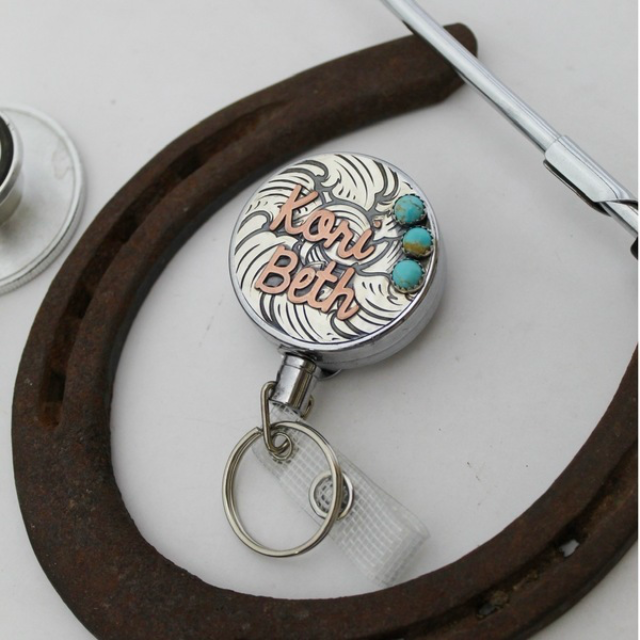 Badge reel covers made in two styles: Cowboy Style with rope border or Scroll Style