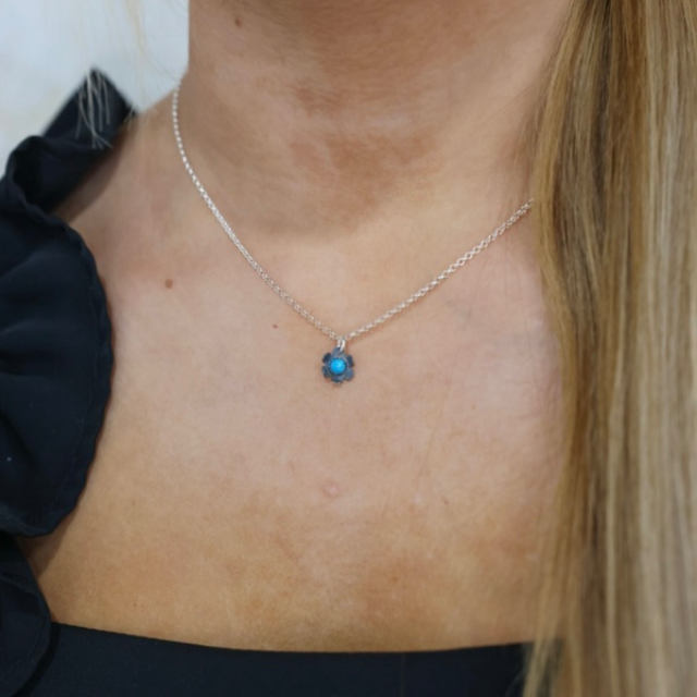 Tiny flower charms with 4 mm stone in the middle comes on an adjustable 16-20" sterling silver chain.