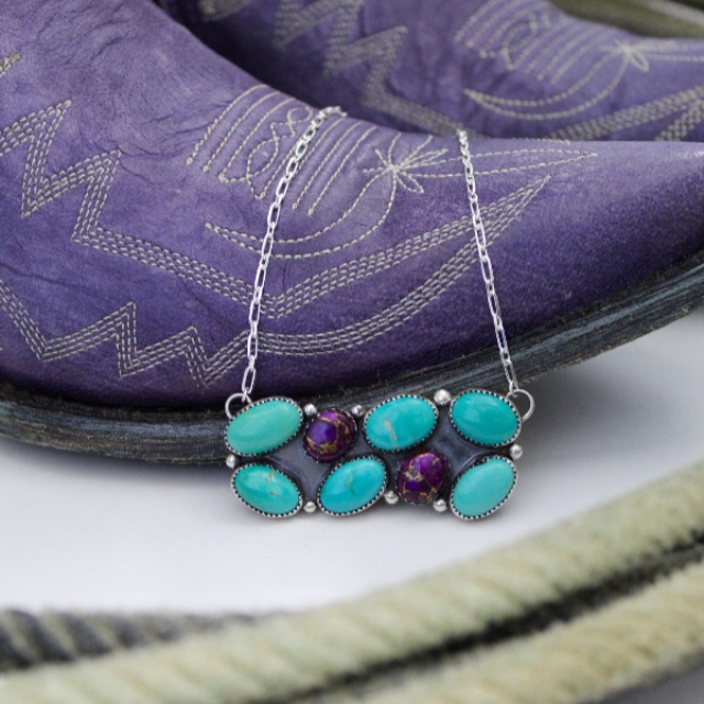 Hand crafted in sterling silver with kingman turquoise and purple mohave