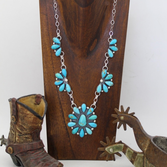 Handmade sterling silver and Kingman turquoise set Necklace is 18” long with 2” drop Earrings are extremely lightweight 2” long